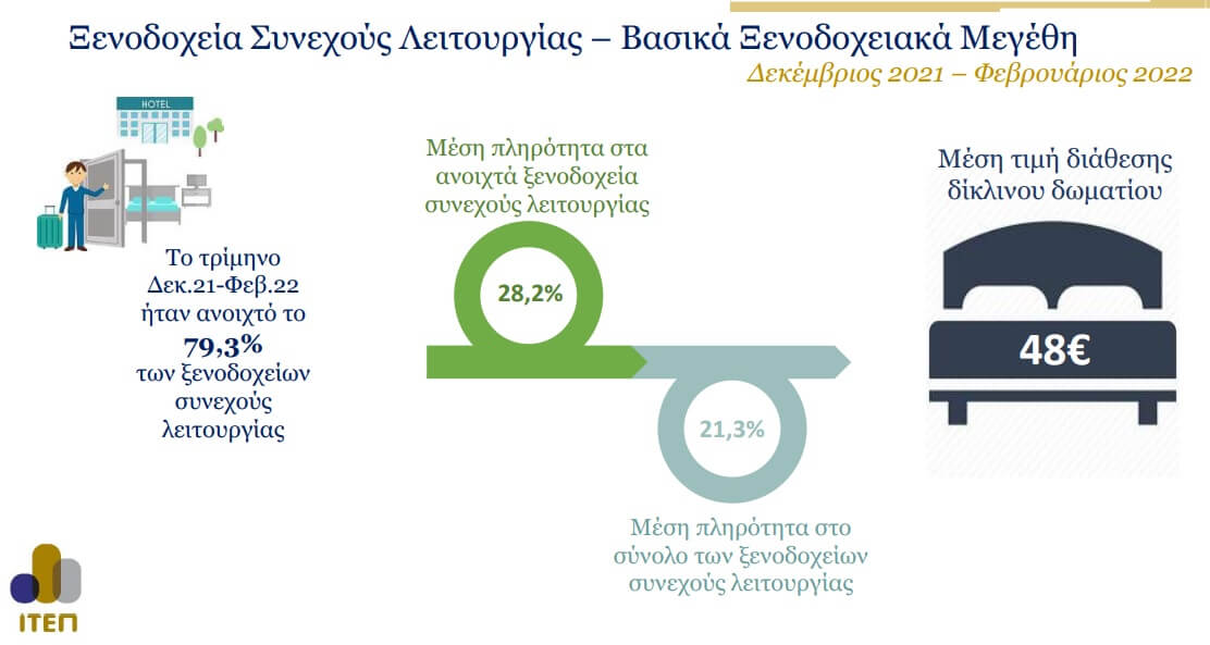 Τα ελληνικά ξενοδοχεία στο τρίμηνο Δεκεμβρίου 2021 – Φεβρουαρίου 2022, είχαν μέση πληρότητα 28,2% και μέση τιμή διάθεσης δίκλινου δωματίου 48 ευρώ.
