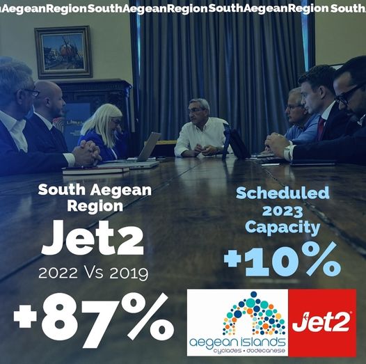 Εκπρόσωποι του βρετανικού τουριστικού ομίλου Jet2, στον οποίο ανήκουν ο tour operator Jet2holidays και η αεροπορική εταιρεία χαμηλού κόστους Jet2, στη συνάντηση εργασίας που είχαν με τον Περιφερειάρχη Νοτίου Αιγαίου Γιώργο Χατζημάρκο, ανακοίνωσαν την αύξηση των αεροπορικών θέσεων για τα νησιά του Νοτίου Αιγαίου το 2023.