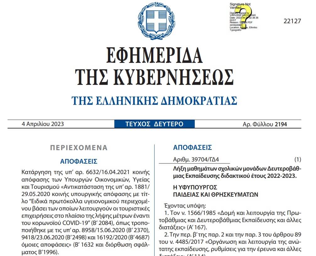 1. Κατάργηση των πρωτοκόλλων υγειονομικού περιεχόμενου των τουριστικών επιχειρήσεων από 4/4/2023 με την ΚΥΑ 6969/3.04.2023 (ΦΕΚ Β’ 2194/4.4.2023) με τίτλο «Κατάργηση της υπ’ αρ. 6632/16.04.2021 κοινής απόφασης των Υπουργών Οικονομικών, Υγείας και Τουρισμού «Αντικατάσταση της υπ’ αρ. 1881/29.05.2020 κοινής υπουργικής απόφασης με τίτλο «Ειδικά πρωτόκολλα υγειονομικού περιεχομένου βάσει των οποίων λειτουργούν οι τουριστικές επιχειρήσεις στο πλαίσιο της λήψης μέτρων έναντι του κορoνοϊού COVID-19” (Β’ 2084), όπως τροποποιήθηκε με τις υπ’ αρ. 8958/15.06.2020 (Β’ 2370), 9418/23.06.2020 (Β’ 2498) και 16192/2020 (Β’ 4687) όμοιες αποφάσεις» (Β’ 1632 και διόρθωση σφάλματος Β’1996)»…