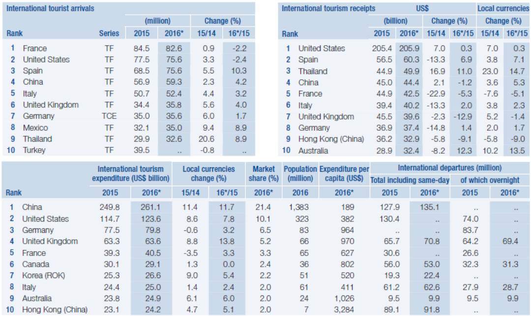 Σύμφωνα με τα στοιχεία του Παγκόσμιου Οργανισμού Τουρισμού (WTO), στην πρώτη θέση της παγκόσμιας κατάταξης σε ότι έχει να κάνει με τις αφίξεις τουριστών από το εξωτερικό, παρέμεινε η Γαλλία το 2016.