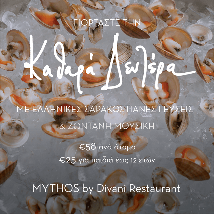 Την Καθαρά Δευτέρα, γιορτάζουμε τα κούλουμα & καλωσορίζουμε την Άνοιξη, στο εστιατόριο Mythos by Divani του ξενοδοχείου Divani Apollon Palace & Thalasso, με θησαυρούς της θάλασσας και νηστίσιμες νοστιμιές, σε ένα μαγικό περιβάλλον, με φόντο το απέραντο γαλάζιο της Αθηναϊκής Ριβιέρας.