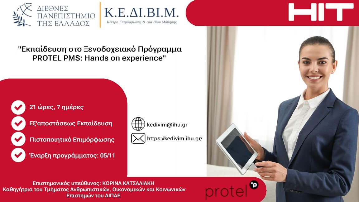 Ένα νέο πρόγραμμα πιστοποιημένης επιμόρφωσης «Εκπαίδευση στο Ξενοδοχειακό Πρόγραμμα PROTEL PMS: Hands on experience», από το Κέντρο Δια Βίου Μάθησης (ΚΕΔΙΒΙΜ) του Διεθνούς Πανεπιστημίου της Ελλάδος (kedivim-apply.ihu.gr/) και την ΗΙΤ Hospitality Integrated Technologies Α.Ε (hit.com.gr/hospitality/protel).