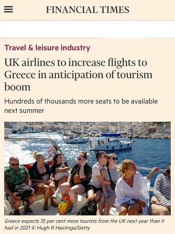 «Έχοντας συναντήσει τις περισσότερες αεροπορικές εταιρείες και παρόχους τουριστικών υπηρεσιών στο Ηνωμένο Βασίλειο, δεν μπορούμε παρά να είμαστε πολύ αισιόδοξοι για το 2022», είπε στους Financial Times ο Υπουργός Τουρισμού Βασίλης Κικίλιας, επισημαίνοντας ότι «το 2022 η Ελλάδα αναμένει 35% περισσότερους επισκέπτες από το Ηνωμένο Βασίλειο σε σχέση με το 2021».