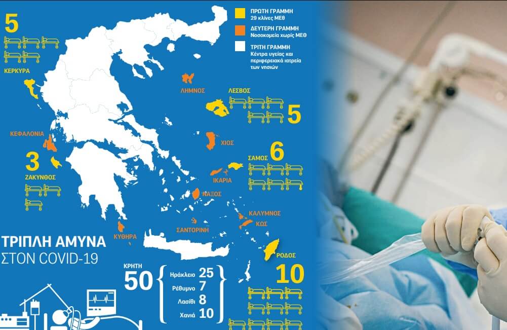 Όσον αφορά τα νοσοκομεία νησιών που δεν διαθέτουν κλίνες ΜΕΘ, σε αυτά θα αναπτυχθούν απλές κλίνες για Covid-19, με μια σχετική απόσταση μεταξύ τους, ενώ όπου υπάρχει δυνατότητα θα διαχωριστούν οι κλινικές, προκειμένου να οριστεί μία αποκλειστικά για περιστατικά κορονοϊού (Χίος, Κεφαλλονιά, Σαντορίνη, Κύθηρα, Ικαρία, Λήμνος, Κάλυμνος, Κως, Νάξος).