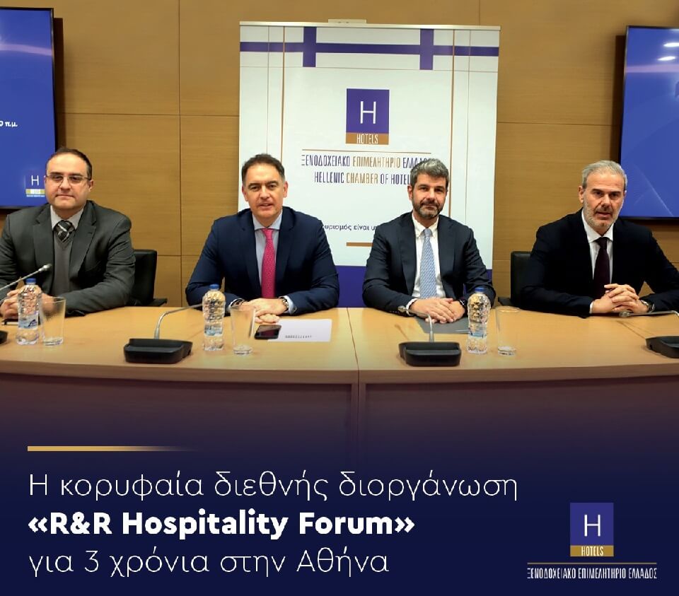 Τη διεξαγωγή της κορυφαίας διεθνούς διοργάνωσης «Resort & Residential Hospitality Forum» (R&R) για τα προσεχή τρία χρόνια στην Αθήνα, ανακοίνωσαν χθες (31/01) από κοινού, ο Πρόεδρος του Ξενοδοχειακού Επιμελητηρίου Ελλάδας (Ξ.Ε.Ε.) Αλέξανδρος Βασιλικός, ο Διευθύνων Σύμβουλος της Enterprise Greece Μαρίνος Γιαννόπουλος και ο Γενικός Γραμματέας του Ελληνικού Οργανισμού Τουρισμού (ΕΟΤ) Δημήτρης Φραγκάκης.