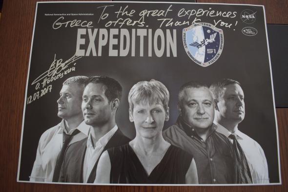 O Ρώσος κοσμοναύτης παρέδωσε στην κα Κουντουρά αφίσα της αποστολής την οποία υπέγραψε προσωπικά για τις «εξαιρετικές εμπειρίες που η Ελλάδα προσφέρει».