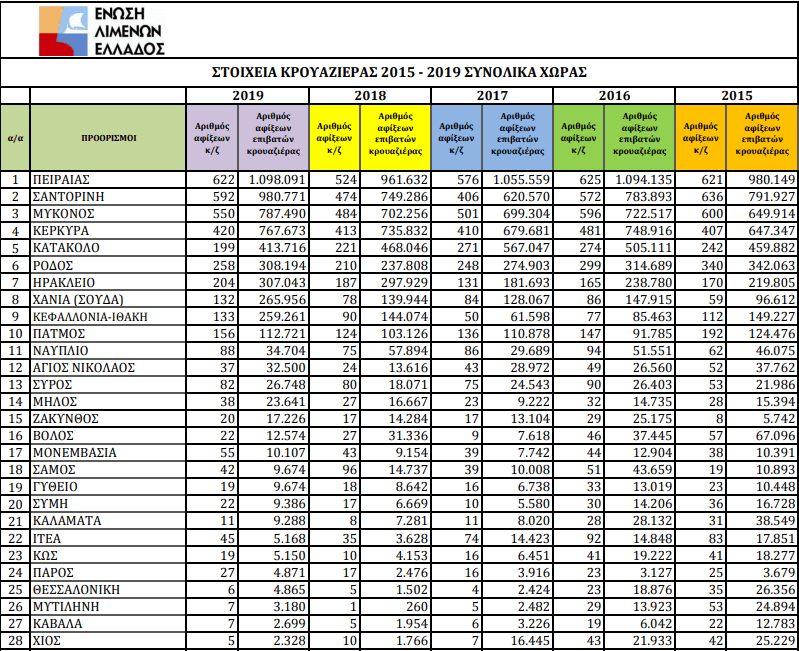 Σύμφωνα με τα στοιχεία της Ένωσης Λιμένων Ελλάδος (ΕΛΙΜΕ), οι αφίξεις κρουαζιερόπλοιων σε 43 λιμάνια της χώρας ανήλθαν το 2019 στις 3.899 (από 3.410 το 2018), σημειώνοντας αύξηση 14,34% και οι αφίξεις επιβατών κρουαζιέρας ανήλθαν στα 5.537.500 (από 4.788.642 το 2018), σημειώνοντας αύξηση 15,64%.