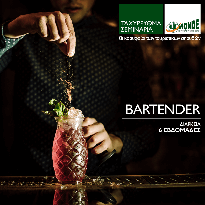 Ο εκπαιδευτικός όμιλος LE MONDE, που προσφέρει από το 1996 αποκλειστικά ξενοδοχειακές, τουριστικές και γαστρονομικές σπουδές, υλοποιεί ένα νέο ταχύρρυθμο πρόγραμμα εκπαίδευσης bartenders, που μπορούν να απασχοληθούν σε κάθε είδους επιχείρηση εστίασης.