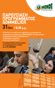 Την Τρίτη 31 Οκτωβρίου στις 17.30 η σχολή LE MONDE μας περιμένει για μια μοναδική περιήγηση στον κόσμο του κρασιού. Οι έμπειροι και καταξιωμένοι καθηγητές του προγράμματος επαγγελματικής εξειδίκευσης Sommelier – Οινοχόος, που ξεκινάει τη Δευτέρα 13 Νοεμβρίου, θα παρουσιάσουν τις θεματικές ενότητες που θα διδαχθούν και θα δώσουν απαντήσεις σε όλα τα ερωτήματα.