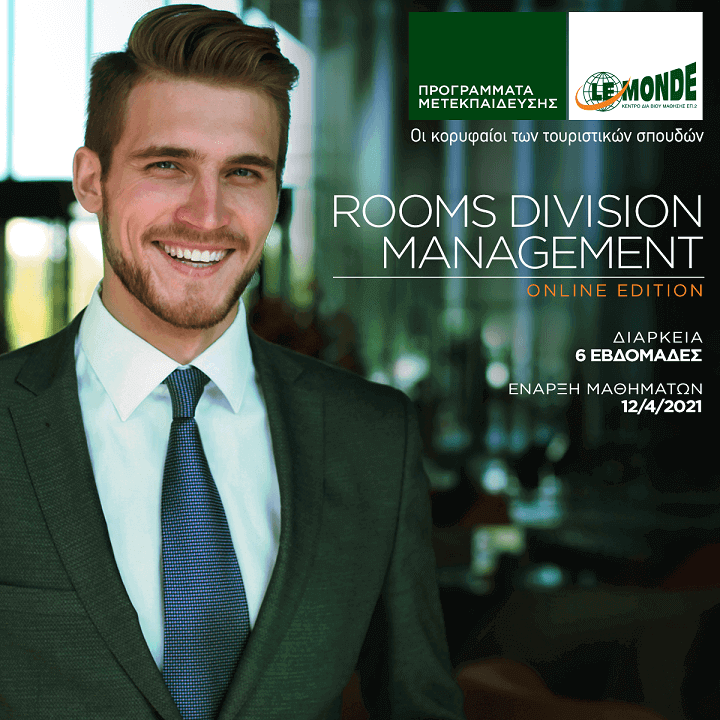 Το πρόγραμμα Rooms Division Management Online Edition (https://www.lemonde.edu.gr/rooms-division-management/) προσφέρει εξειδίκευση στην οργάνωση, λειτουργία και αποτελεσματική διαχείριση των τμημάτων μιας ξενοδοχειακής μονάδας (front-office, reservation department, housekeeping, concierge & guest services, maintenance department), εξασφαλίζοντας στους συμμετέχοντες την επαφή με διακεκριμένα στελέχη της ξενοδοχειακής αγοράς καθώς και τη δυνατότητα να διευρύνουν τις γνώσεις τους μέσα από σύγχρονες εκπαιδευτικές μεθόδους.