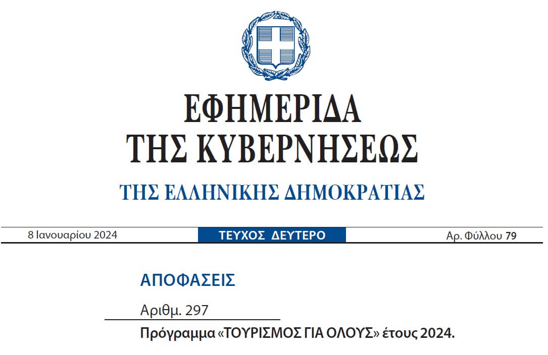 Δημοσιεύθηκε στην Εφημερίδα της Κυβερνήσεως – ΦΕΚ (Β’ 79/2024) η με α.π. 297/05.01.2024 κοινή υπουργική απόφαση με όλες τις λεπτομέρειες του προγράμματος Τουρισμός για Όλους έτους 2024 του Υπουργείου Τουρισμού, με φορέα υλοποίησης την Κοινωνία της Πληροφορίας Μ.Α.Ε.