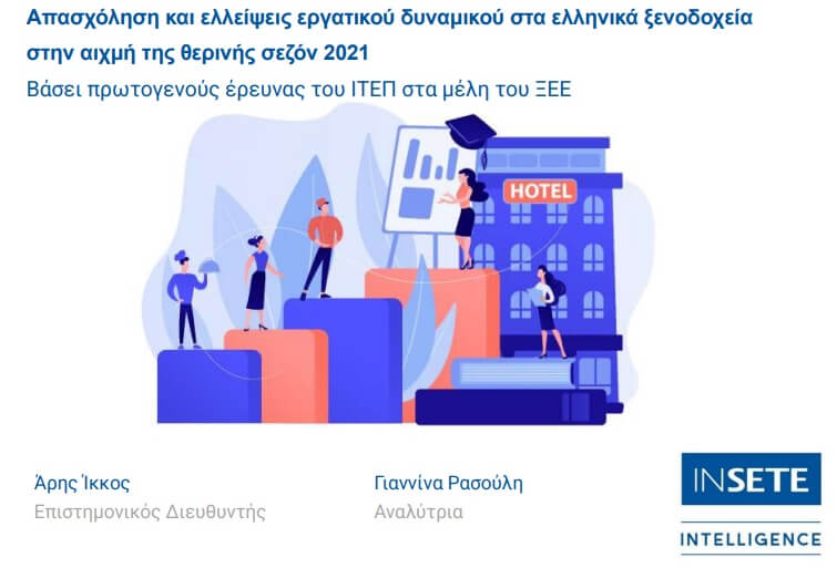 Τα παραπάνω προκύπτουν από τη νέα μελέτη του ΙΝΣΕΤΕ με θέμα: H «Απασχόληση και ελλείψεις εργατικού δυναμικού στα ελληνικά ξενοδοχεία στην αιχμή της θερινής σεζόν 2021», η οποία εκπονήθηκε με την αξιοποίηση στοιχείων πρωτογενούς έρευνας που διενήργησε το Ινστιτούτο Τουριστικών Ερευνών και Προβλέψεων (ΙΤΕΠ) του Ξενοδοχειακού Επιμελητηρίου Ελλάδος (ΞΕΕ) στα μέλη του ΞΕΕ.