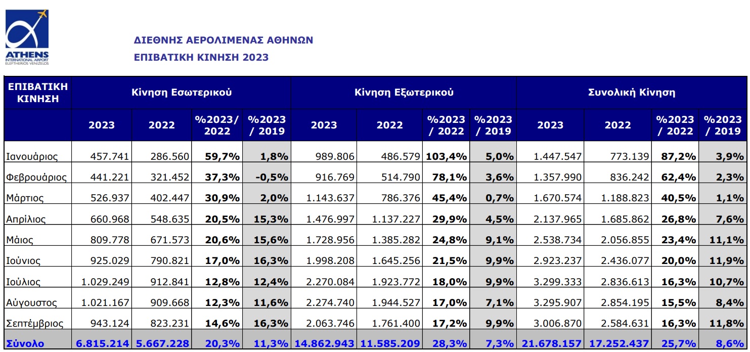 Tους εννέα (Ιανουάριος – Σεπτέμβριος) πρώτους μήνες του 2023, η επιβατική κίνηση του αεροδρομίου της Αθήνας ανήλθε σε 21.678.157, αυξημένη κατά 25,7% σε σύγκριση με το αντίστοιχο διάστημα του 2022, αλλά και κατά 8,6% σε σύγκριση με ίδιο διάστημα του 2019.