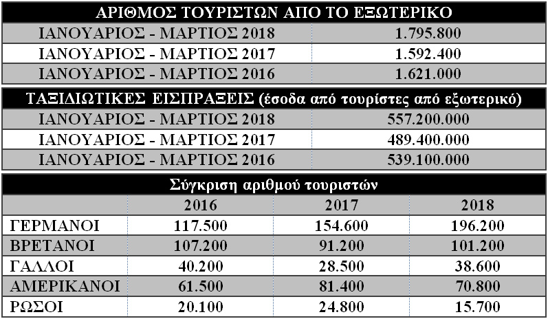 Την περίοδο Ιανουαρίου – Μαρτίου 2018, οι ταξιδιωτικές εισπράξεις εμφάνισαν αύξηση κατά 13,9% σε σύγκριση με την αντίστοιχη περίοδο του 2017 και διαμορφώθηκαν στα 557 εκατ. ευρώ.