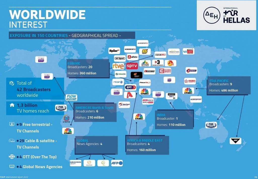 Οι εικόνες από το Διεθνή Ποδηλατικό Γύρο της Ελλάδας ταξίδεψαν σε πέντε Ηπείρους, καθώς η τηλεοπτική παραγωγή της EBU που διανείμει τη διοργάνωση είχε συνάψει συμφωνίες με περισσοτέρους από 40 διεθνείς τηλεοπτικούς σταθμούς.