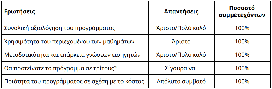 Η εικόνα αυτή αποτυπώνεται στα αποτελέσματα φόρμας ικανοποίησης που συμπληρώνουν ανώνυμα οι συμμετέχοντες μερικά εκ των οποίων παρουσιάζονται στον παρακάτω πίνακα: