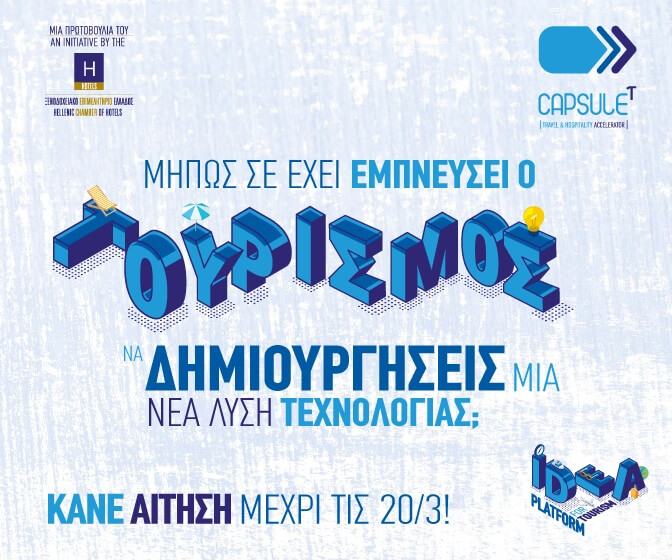 Ο CapsuleT Travel & Hospitality Accelerator, πρωτοβουλία του Ξενοδοχειακού Επιμελητηρίου Ελλάδας (ΞΕΕ), αναζητά τεχνολογικές ιδέες για τον τουρισμό με έμφαση στις λύσεις βιωσιμότητας, fintech, διαχείριση μεγάλων δεδομένων, AI solutions.