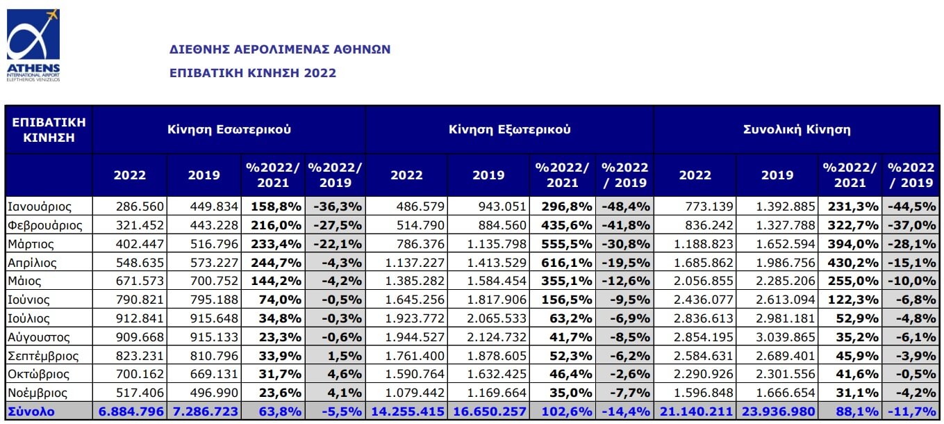 Η επιβατική κίνηση του αεροδρομίου της Αθήνας τους 11 πρώτους μήνες του 2022, έφτασε τα 21,14 εκατ. και παρέμεινε μειωμένη κατά 11,7% σε σύγκριση με το 2019 (Ιανουάριος – Νοέμβριος 2022: 21.140.211 επιβάτες, Ιανουάριος – Νοέμβριος 2019: 23.936.980 επιβάτες).