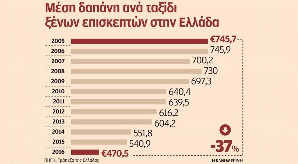 Σύμφωνα με τη μελέτη, η μέση δαπάνη ανά τουρίστα από 745,7 ευρώ το 2005, μειώθηκε σε μόλις 470,5 ευρώ το 2016.