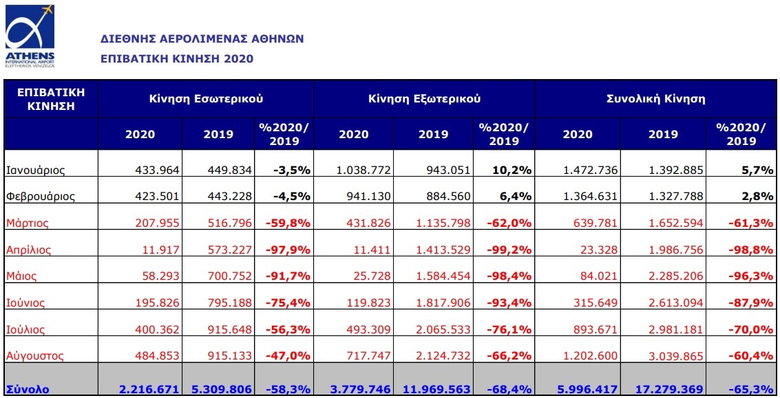 Την περίοδο Ιανουαρίου – Αυγούστου του 2020, η κίνηση του αεροδρομίου της Αθήνας ανήλθε στα 5.996.417 επιβάτες, σημειώνοντας μείωση της τάξης του 65,3% σε σχέση με το ίδιο διάστημα 2019, που διακινήθηκαν 17.279.369 επιβάτες.
