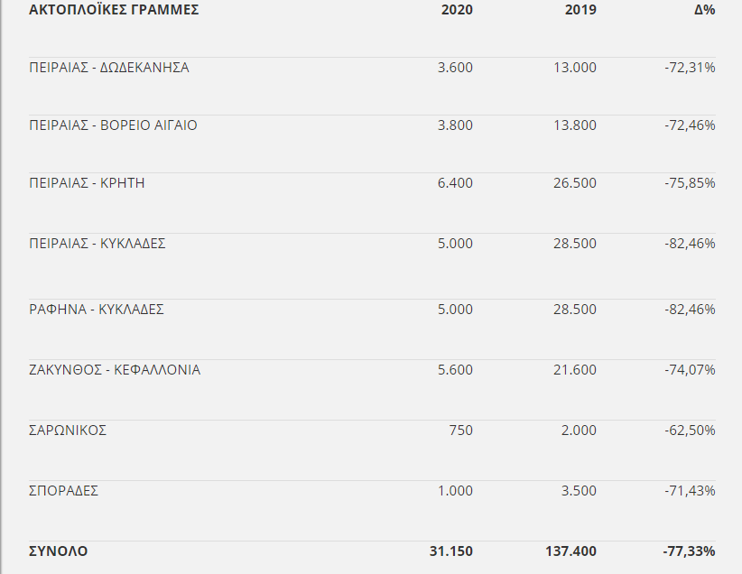 Μειωμένη κατά 77,33% ήταν η επιβατική κίνηση το διάστημα 16 – 22 Μαρτίου σε σύγκριση με το αντίστοιχο διάστημα του 2019, σύμφωνα με τα στοιχεία που έδωσε στη δημοσιότητα ο Σύνδεσμος Επιχειρήσεων Επιβατηγού Ναυτιλίας (ΣΕΕΝ).