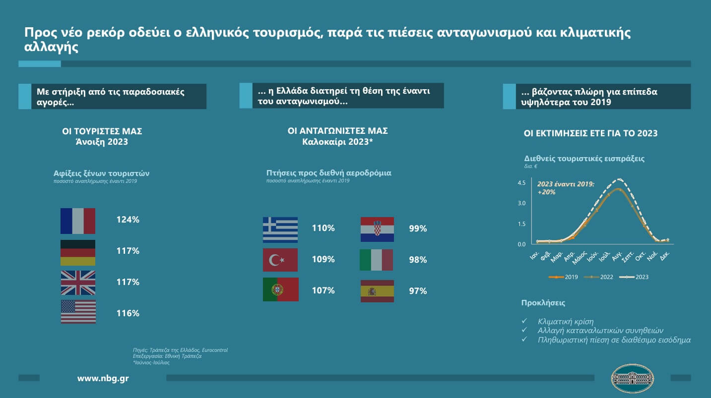 Η δυναμική της άνοιξης, τα πρώτα θετικά σημάδια από τις καλοκαιρινές κρατήσεις και η βελτίωση της καταναλωτικής εμπιστοσύνης στις κύριες αγορές μας έχουν θέσει τις βάσεις για επίτευξη νέου ρεκόρ αφίξεων το 2023 για τον ελληνικό τουρισμό.