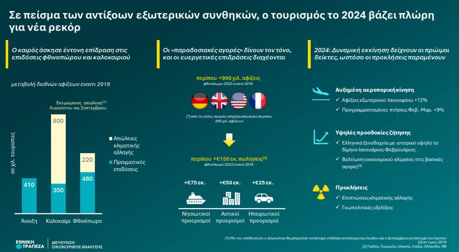 «Σε πείσμα των αντίξοων εξωτερικών συνθηκών, ο τουρισμός το 2024 βάζει πλώρη για νέα ρεκόρ», επισημαίνει το νέο τεύχος της σειρά μελετών συγκυρίας «Τάσεις του επιχειρείν» της Διεύθυνσης Οικονομικής Ανάλυσης της Εθνικής Τράπεζας.
