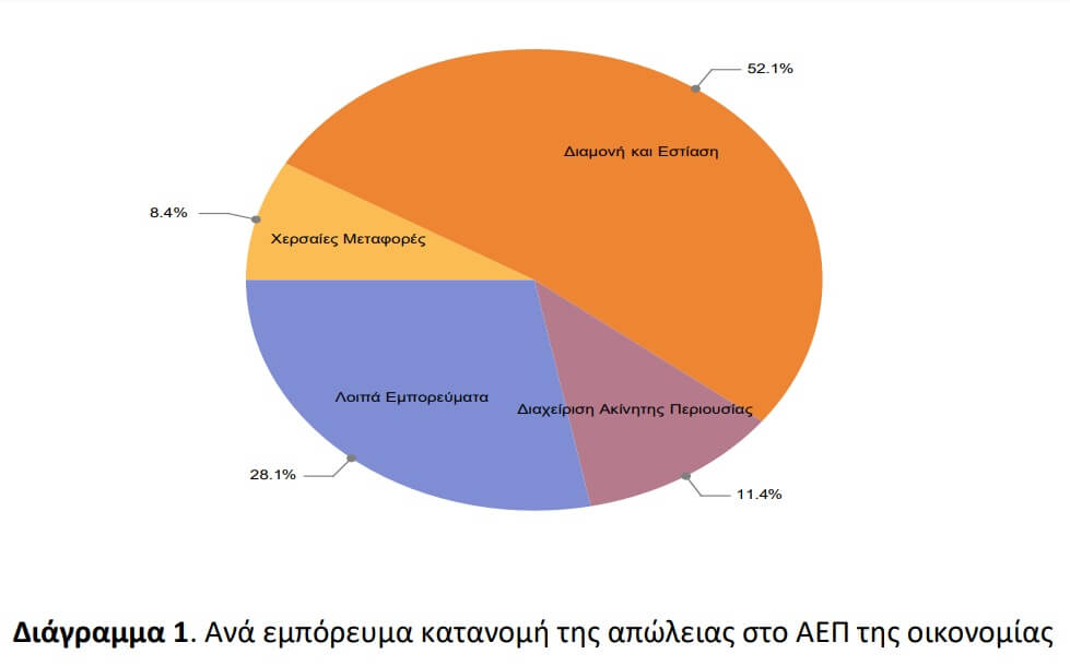Χερσαίες Μεταφορές 8,4%, Διαμονή και Εστίαση 52,1%, Διαχείριση Ακίνητης Περιουσίας 11,4%, Λοιπά Εμπορεύματα 28,1%, Γεωργία 17,9%, Χερσαίες Μεταφορές 5,9%, Διαμονή και Εστίαση 31%, Λοιποί Τομείς 45,2%.