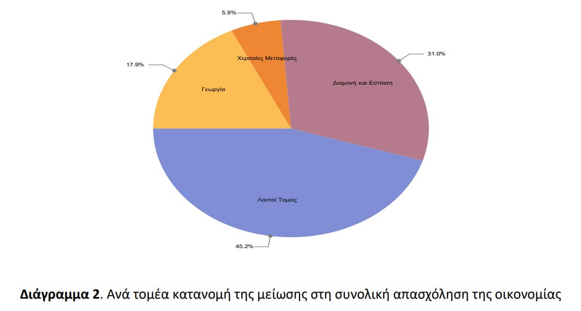 • Μείωση της απασχόλησης στην οικονομία κατά περίπου 26.403 απασχολούμενους, η οποία κατανέμεται ανά τομέα οικονομικής δραστηριότητας σύμφωνα με το Διάγραμμα 2.