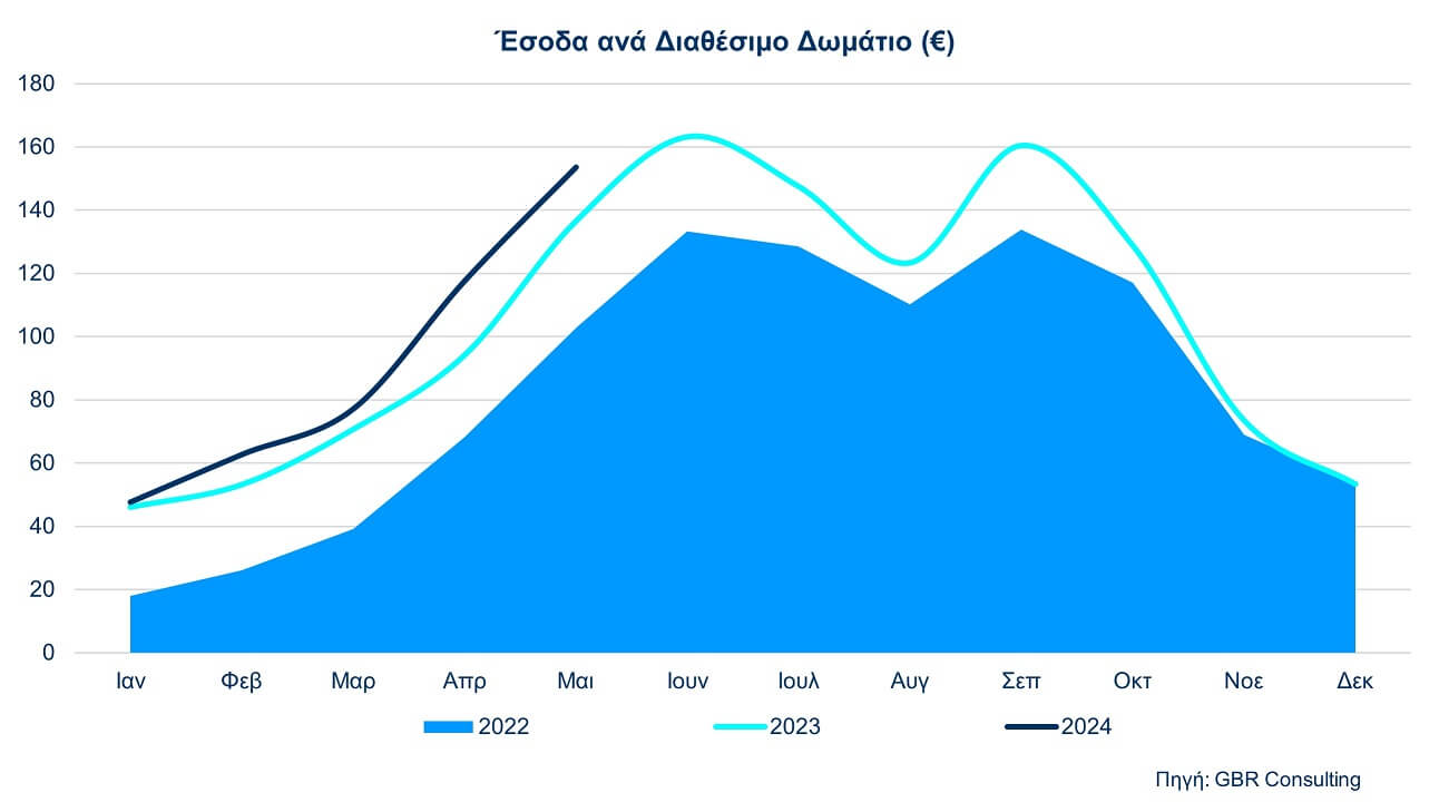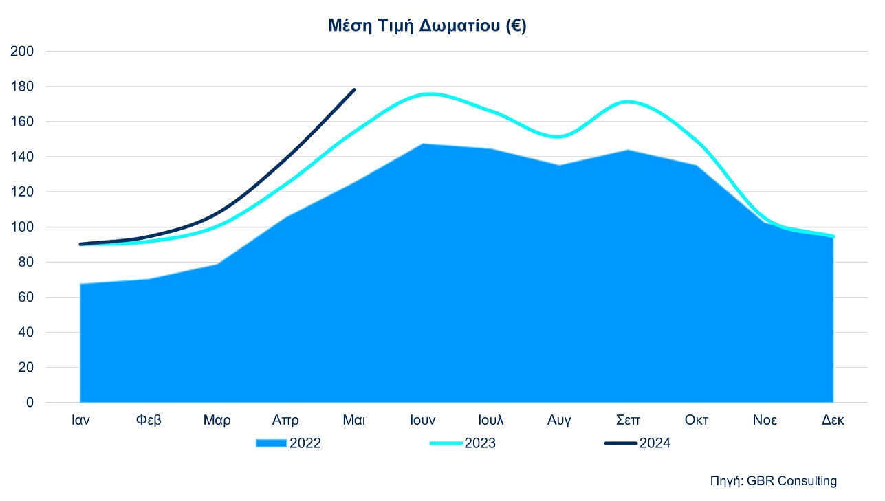 Η Μέση Τιμή Δωματίου (ADR) Μαΐου 2024 λοιπόν ήταν 178,16 ευρώ (δηλ. σημείωσε αύξηση κατά 15,6% έναντι του περσυνού Μαΐου) και το Έσοδο ανά Διαθέσιμο Δωμάτιο (RevPar) Μαΐου 2024 ήταν 153,50 ευρώ (αύξηση κατά 12,4% έναντι του αντίστοιχου RevPar Μαΐου 2023).