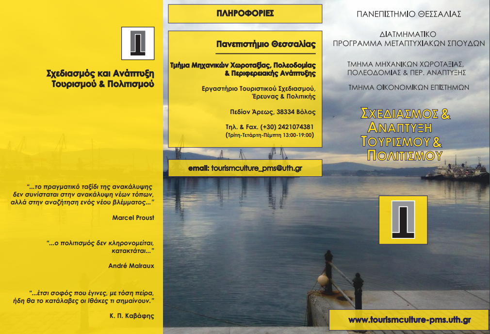 Το Τμήμα Μηχανικών Χωροταξίας, Πολεοδομίας και Περιφερειακής Ανάπτυξης και το Τμήμα Οικονομικών Επιστημών του Πανεπιστημίου Θεσσαλίας καλoύν τους ενδιαφερόμενους να υποβάλουν υποψηφιότητα για την παρακολούθηση του Διατμηματικού Προγράμματος Μεταπτυχιακών Σπουδών (ΔΠΜΣ) «Σχεδιασμός και Ανάπτυξη Τουρισμού και Πολιτισμού» (ΣΑΤΠ) για το ακαδημαϊκό έτος 2018 – 2019.