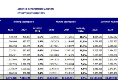 Τους πρώτους εννέα μήνες (Ιανουάριος - Σεπτέμβριος) του 2025, η κίνηση του αεροδρομίου της Αθήνας έφθασε τα 26.193.259 επιβάτες, σημειώνοντας