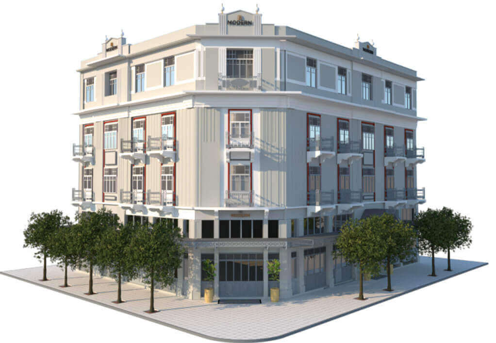 Το 4άστερο Modern διαθέτει συνολικά 51 δωμάτια και μία grand suite στον τρίτο όροφο, ενώ οι χώροι του υπογείου θα είναι αφιερωμένοι στο wellness (σάουνα, υδρομασάζ τύπου τζακούζι κ.ά.).