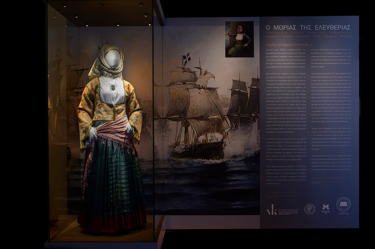 Παράλληλα, σε συνεργασία με το Ίδρυμα Γεωργίου και Βικτωρίας Καρέλια και το Λύκειον των Ελληνίδων Καλαμάτας, δημιουργήθηκε η σπονδυλωτή έκθεση Ελληνικών ενδυμασιών «Ο Μοριάς της Ελευθερίας», που παρουσιάζει παραδοσιακές τοπικές φορεσιές της Πελοποννήσου και του Αργοσαρωνικού.