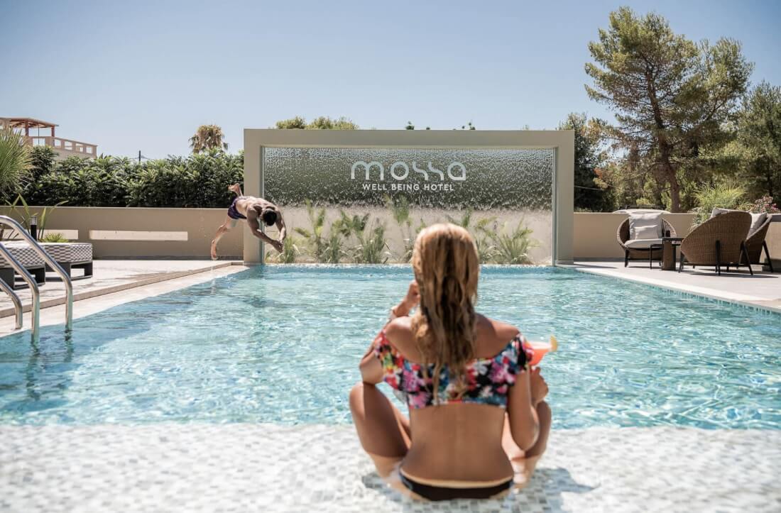 Μέσα από αυτό το πρίσμα γεννήθηκε το Mossa Well Being Hotel: Mossa που σημαίνει κίνηση στα ιταλικά, συνοδευόμενο με το tagline «well being», που υποδηλώνει τις δραστηριότητες ευεξίας που μπορεί να απολαύσει ο επισκέπτης, εντός και εκτός του καταλύματος.