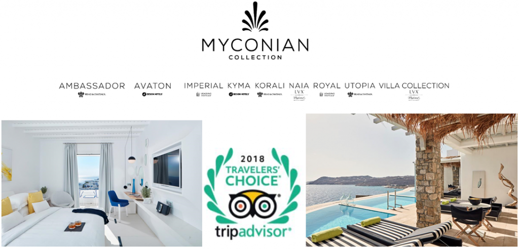 Τα ξενοδοχειακά συγκροτήματα Myconian Villa Collection και Myconian Ambassador Relais & Chateaux, της ξενοδοχειακής αλυσίδας Myconian Collection Hotels & Resorts, ψηφίστηκαν στα «Top 25 Luxury Hotels in Greece» και «Top Hotels in Greece», στα Trip Advisor Travellers’ Choice® awards 2018.