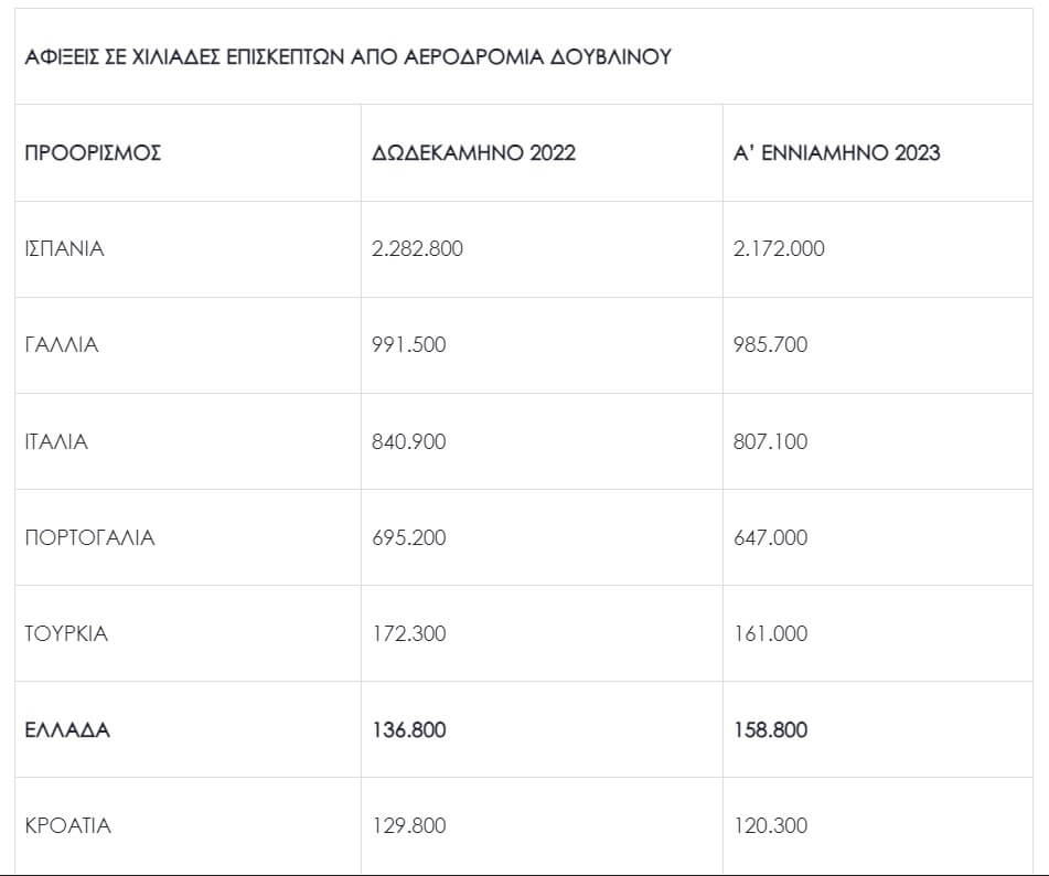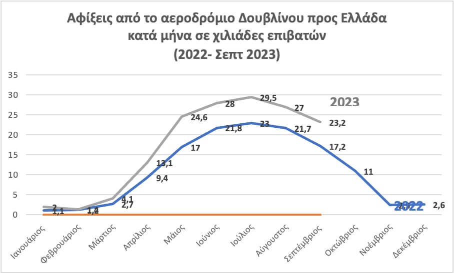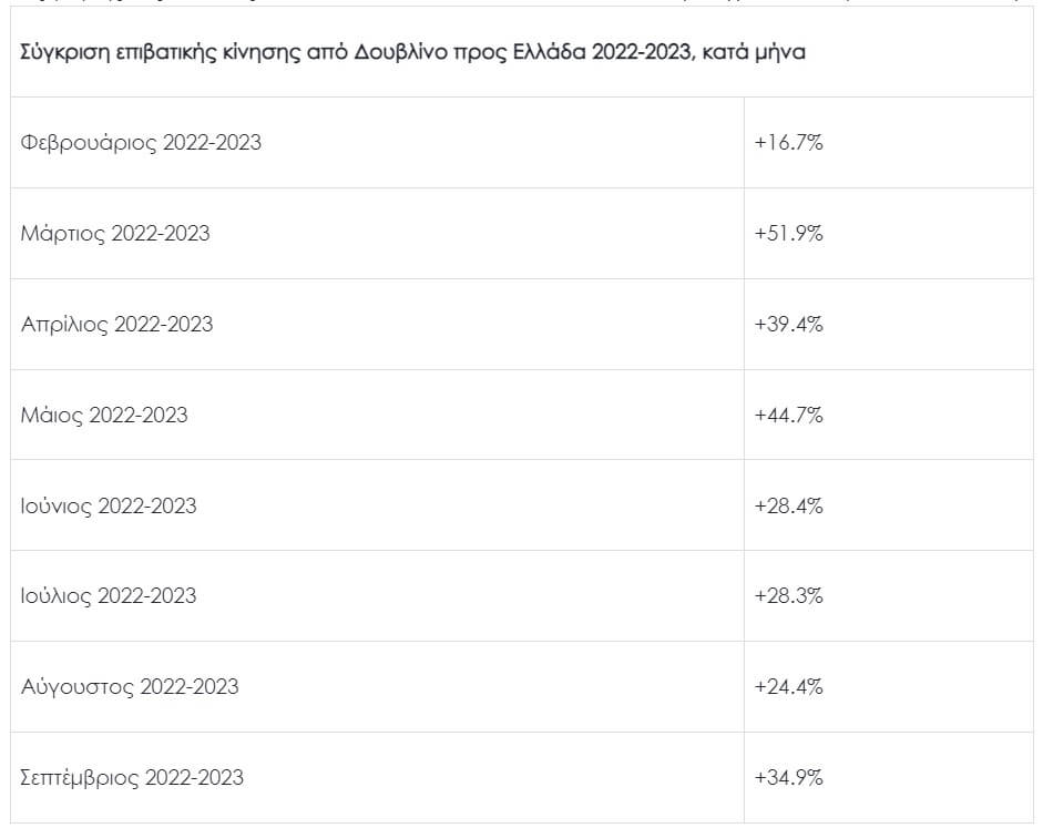 Την περίοδο Φεβρουάριος – Σεπτέμβριος 2022 – 2023, η μεσοσταθμική αύξηση των αφίξεων από το αεροδρόμιο του Δουβλίνου προς την Ελλάδα ξεπέρασε το 33%, με το Μάιο να έχει τη μεγαλύτερη αύξηση της σεζόν, όπως αποτυπώνεται και στον ακόλουθο πίνακα (στοιχεία από https://data.cso.ie/):
