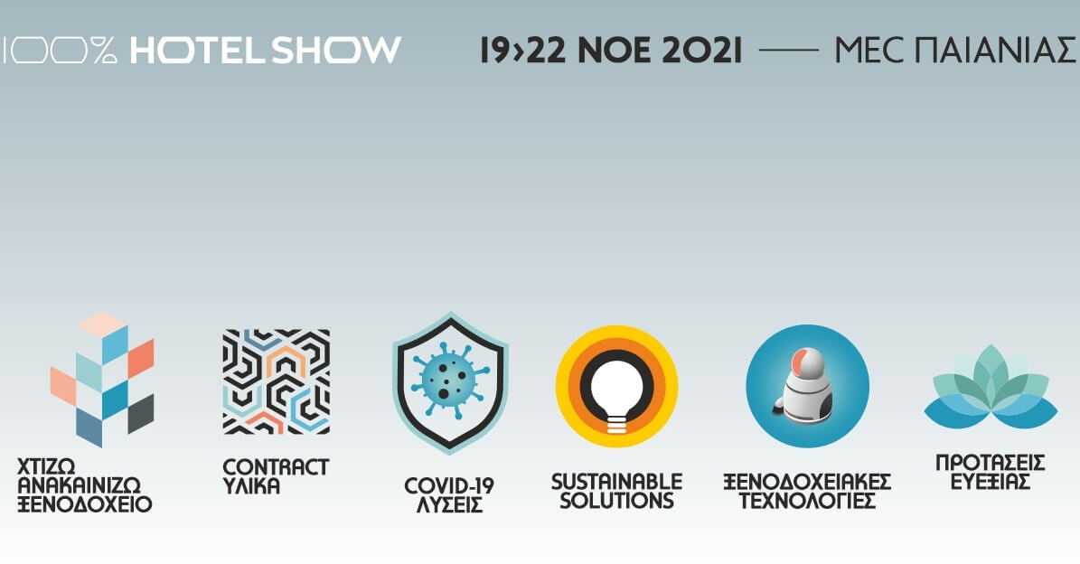 Το 100% Hotel Show θα πραγματοποιηθεί 19 – 22 Νοεμβρίου 2021 στο MEC Παιανίας, εφαρμόζοντας όλα τα απαραίτητα πρωτόκολλα περί διοργάνωσης εκθέσεων για την προστασία από τον COVID-19.