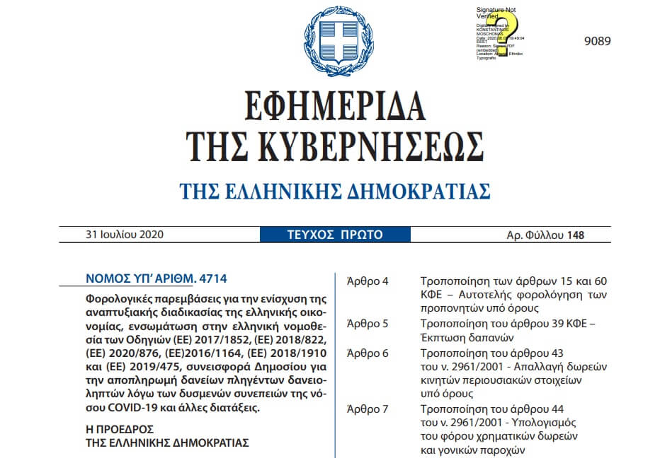 Στο νόμο Ν.4714/31.07.2020 (ΦΕΚ Α’148), που ψηφίστηκε πριν από λίγες ημέρες στη Βουλή, με τίτλο «Φορολογικές παρεμβάσεις για την ενίσχυση της αναπτυξιακής διαδικασίας της ελληνικής οικονομίας …», περιλαμβάνονται οι παρακάτω διατάξεις που αφορούν τις ξενοδοχειακές επιχειρήσεις: