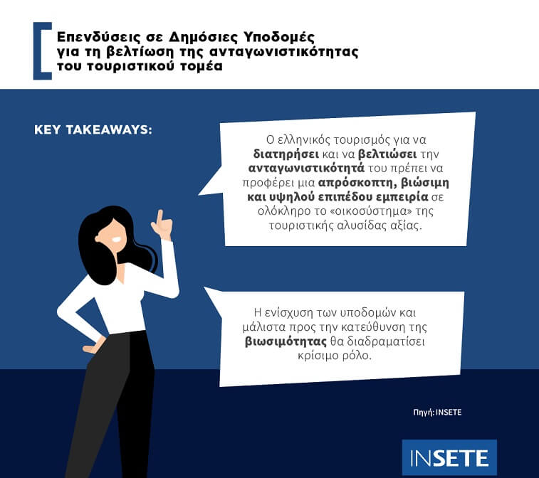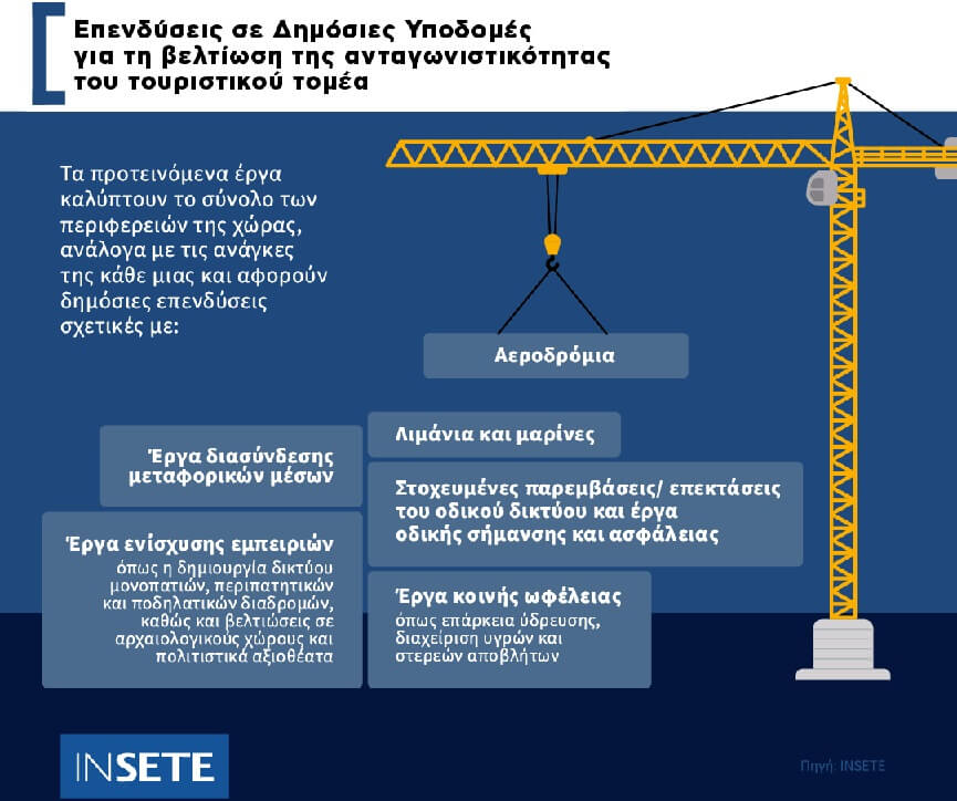 Στη νέα μελέτη με τίτλο: «Επενδύσεις σε Δημόσιες Υποδομές για τη βελτίωση της ανταγωνιστικότητας του τουριστικού τομέα», που εκπόνησε το Ινστιτούτο του Συνδέσμου Ελληνικών Τουριστικών Επιχειρήσεων (ΙΝΣΕΤΕ), παρουσιάζεται μία καταγραφή δημοσίων έργων, που οι άμεσα ενδιαφερόμενοι του τουριστικού τομέα θεωρούν κρίσιμα για την αναβάθμιση της λειτουργίας των τουριστικών προορισμών και συνεπώς απαραίτητα για τη διατήρηση και βελτίωση της διεθνούς ανταγωνιστικότητάς τους.