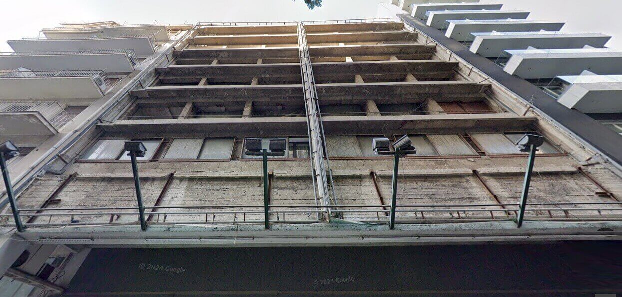 Πρόκειται για κλειστό κτήριο (φωτογραφία), με οικοδομική άδεια από το 1974 για να λειτουργήσει ως ξενοδοχείο, στην οδό Βερανζέρου 12, πίσω από το κτήριο που φιλοξενούσε το πολυκατάστημα «Μινιόν», αλλά και από το 4άστερο ξενοδοχείο Polis Grand (Πατησίων 19 & Βερανζέρου 10).