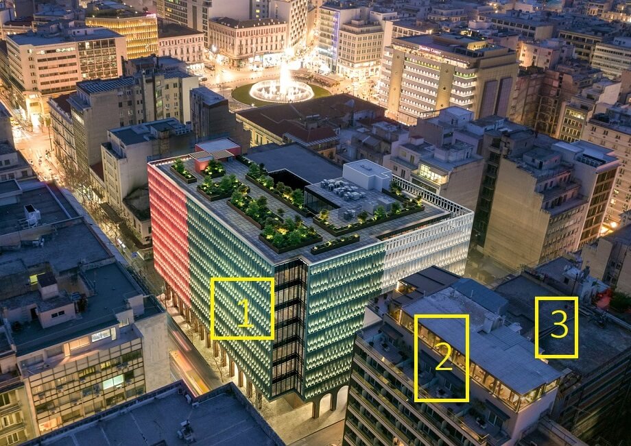 1: Το κτήριο που φιλοξενούσε το «Μινιόν», 2: Το Polis Grand Hotel, 3: Το κτήριο του νέου ξενοδοχείου και στο βάθος η πλατεία Ομονοίας.