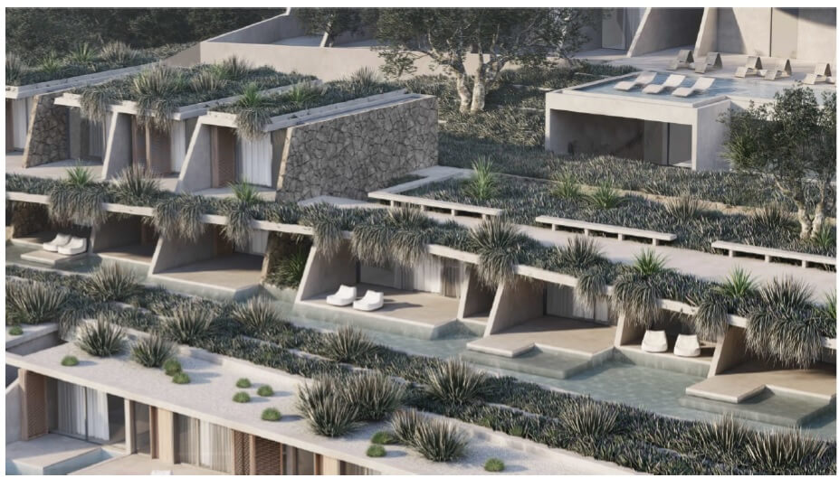 Οι κτηριακές μονάδες που θα κατασκευαστούν ανέρχονται σε 32 μονώροφες και εννέα διώροφες, εκ των οποίων οι 12 υπόσκαφες, ενώ όλα τα κτήρια έχουν φυτεμένα δώματα, με τη φύση ουσιαστικά να καλύπτει την εξωγενή παρέμβαση.