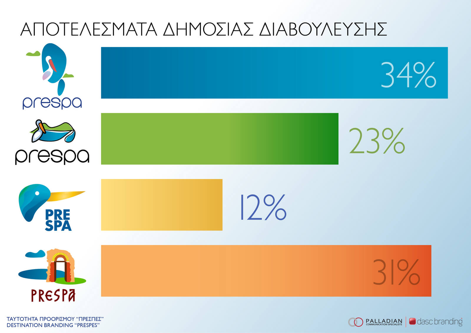 Σε ψηφοφορία τέθηκαν τέσσερις διαφορετικές προτάσεις σήματος με αγγλικό λογότυπο (brand name «PRESPA»).