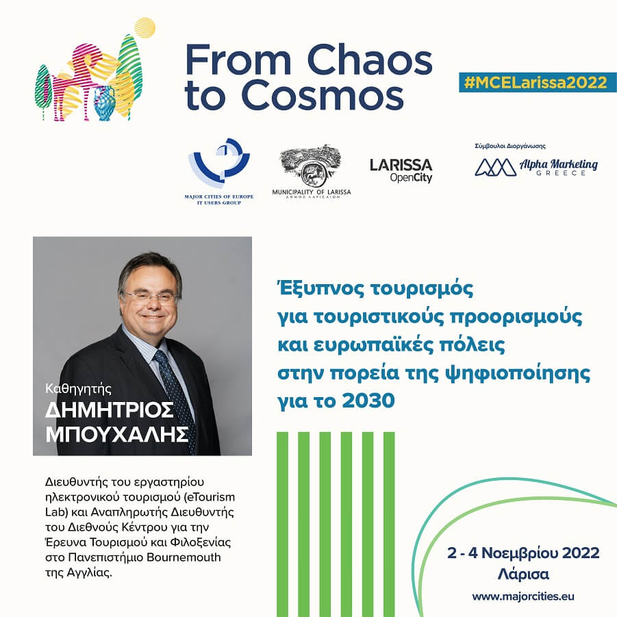 Από τους διοργανωτές του ετήσιου διεθνούς συνεδρίου του Δικτύου των Major Cities of Europe, που θα πραγματοποιηθεί 2 – 4 Νοεμβρίου στη Λάρισα, ανακοινώθηκε η συμμετοχή του διακεκριμένου καθηγητή Δημήτρη Μπούχαλη, με κύρια ομιλία που φέρει τον τίτλο «Έξυπνος τουρισμός για τουριστικούς προορισμούς και ευρωπαϊκές πόλεις στην πορεία της ψηφιοποίησης για το 2030».