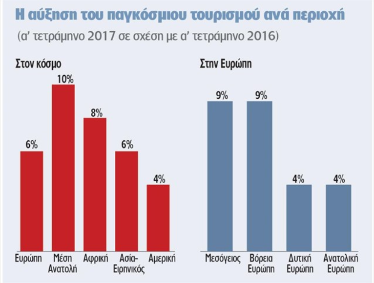 Η Μέση Ανατολή φέτος σημειώνει αύξηση στις διεθνείς αφίξεις κατά 10%, η Αφρική κατά 8%, η Ευρώπη κατά 6% μαζί με την Ασία και τον Ειρηνικό, ενώ η Αμερική φτάνει το 4%.