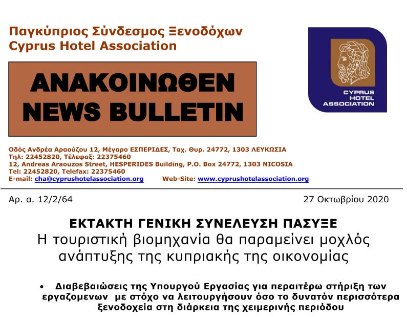 Τα προβλήματα που ταλανίζουν τον κλάδο καθώς και τα επόμενα βήματα με στόχο την ανάκαμψή του, απασχόλησαν την Έκτακτη Γενική Συνέλευση του Παγκυπρίου Συνδέσμου Ξενοδόχων (ΠΑΣΥΞΕ), που πραγματοποιήθηκε την Τρίτη 27 Οκτωβρίου, παρουσία της υπουργού Εργασίας κ. Ζέτας Αιμιλιανίδου και του Υφυπουργού Τουρισμού κ. Σάββα Πέρδιου.