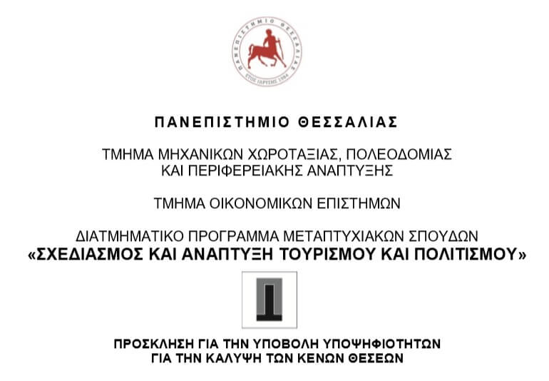 Το Τμήμα Μηχανικών Χωροταξίας, Πολεοδομίας και Περιφερειακής Ανάπτυξης και το Τμήμα Οικονομικών Επιστημών του Πανεπιστημίου Θεσσαλίας καλoύν τους ενδιαφερόμενους να υποβάλουν υποψηφιότητα για την παρακολούθηση του Διατμηματικού Προγράμματος Μεταπτυχιακών Σπουδών (ΔΠΜΣ) «Σχεδιασμός και Ανάπτυξη Τουρισμού και Πολιτισμού» (ΣΑΤΠ) για το ακαδημαϊκό έτος 2019 – 2020.