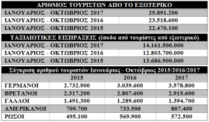 Την περίοδο Ιανουαρίου – Οκτωβρίου 2017, οι ταξιδιωτικές εισπράξεις αυξήθηκαν κατά 1.358.000.000 ευρώ ή 10,6% σε σχέση με το ίδιο διάστημα του 2016 και διαμορφώθηκαν στα 14.161.500.000 ευρώ.