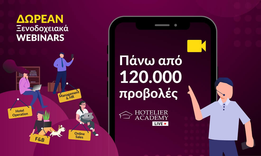 Ο δεύτερος κύκλος των Δωρεάν Ξενοδοχειακών Webinars της Hotelier Academy Greece ολοκληρώθηκε με τεράστια επιτυχία, αφού οι εγγραφές στην ειδικά διαμορφωμένη Ξενοδοχειακή E-Learning Πλατφόρμα ξεπέρασαν τους 8.000 επαγγελματίες, ενώ τα εκπαιδευτικά videos στα social media, ξεπέρασαν ήδη τις 120.000 προβολές.